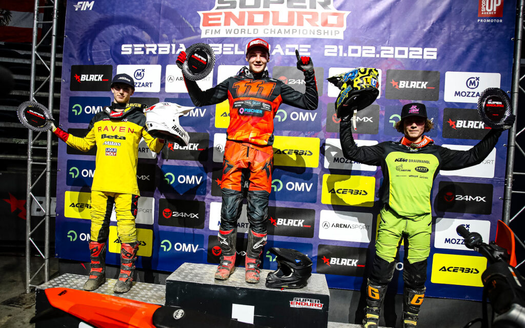Firmly asserting himself as the rider to beat in the Youth Cup class, the SuperEnduro GP of Serbia marked a double victory for championship leader Wojtek Walczak (KTM). Looking strong from the off in Belgrade, the young Polish rider quickly worked his way up to second in Final 1 behind Spain’s Eneko Martinez (Beta). Piling on the pressure, he took the lead on lap five to ultimately secure the opening race win. Behind him, Martinez finished second, with Austria’s Luca Kropitsch (KTM) riding well for third.